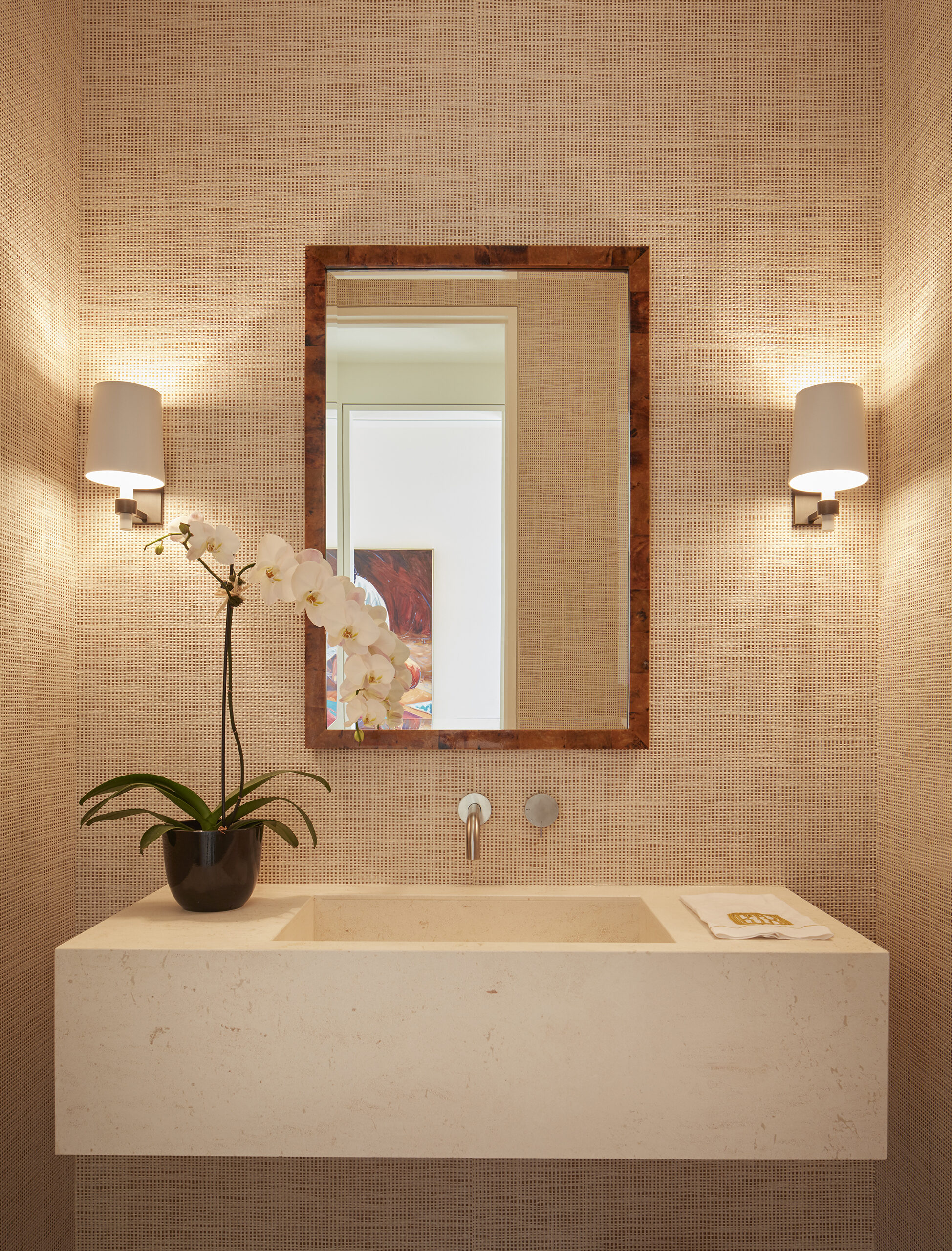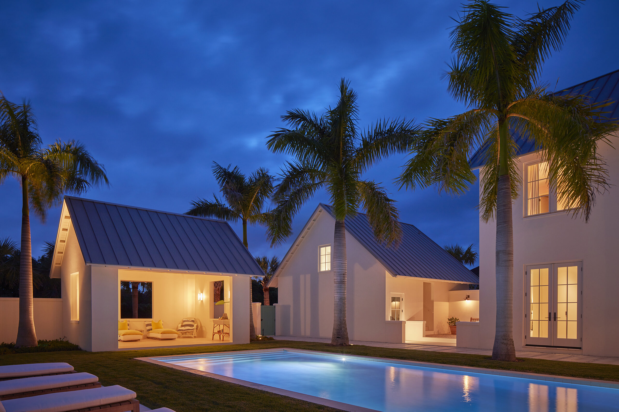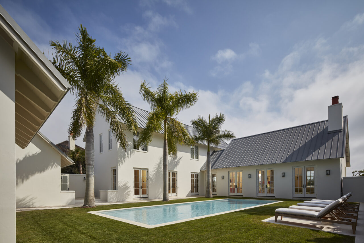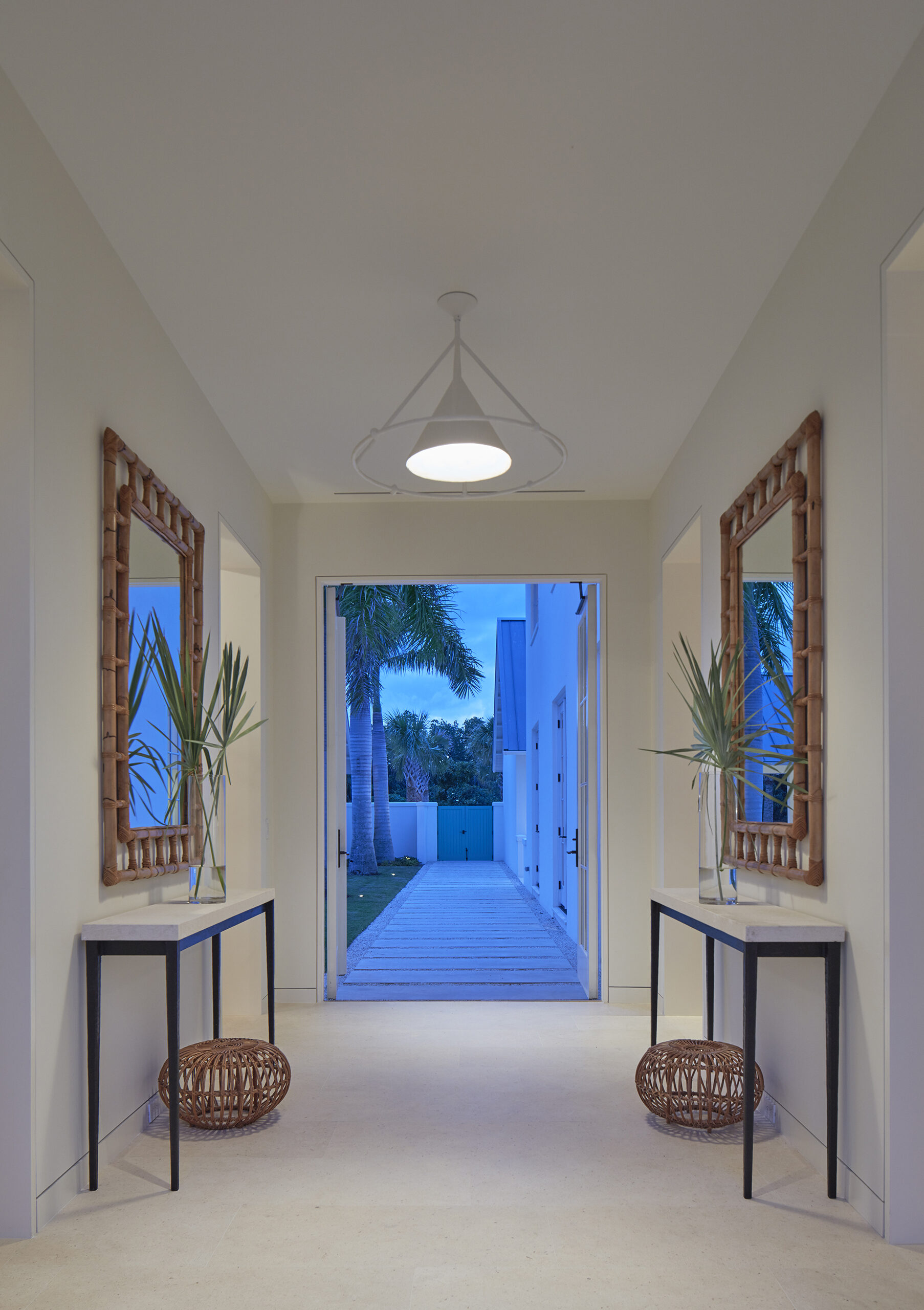 Entry into the home begins through a landscaped entry court along the west side of the site that doubles as guest parking in between a colonnade of palms atop crushed gravel. A white stucco retaining wall extends from the back of an open-air pool pavilion to guard the entrance into the courtyard and procession to the main door.