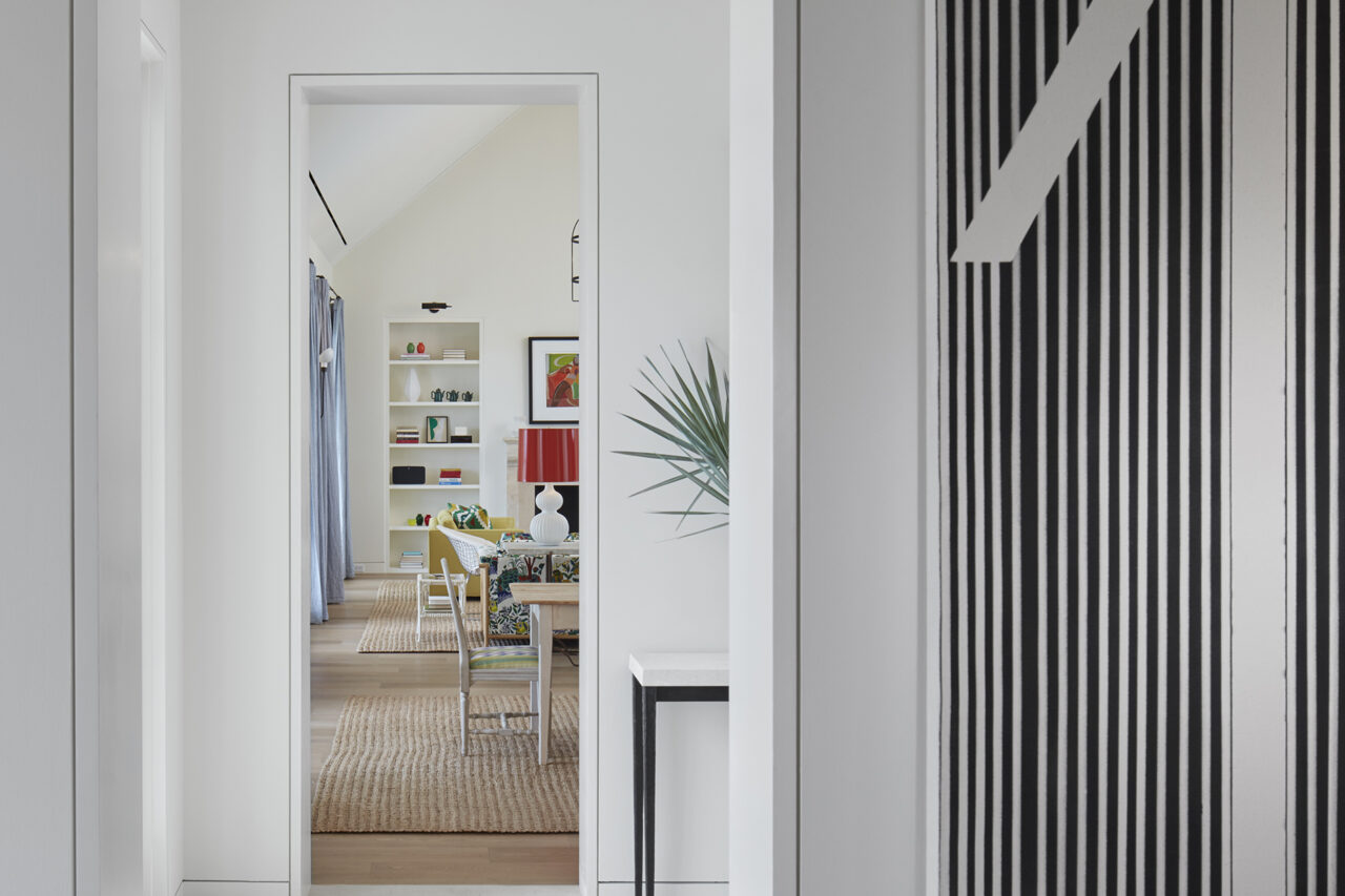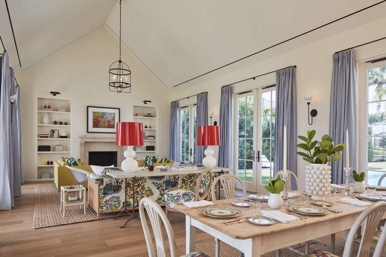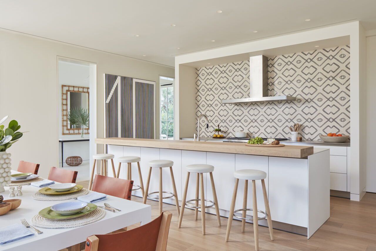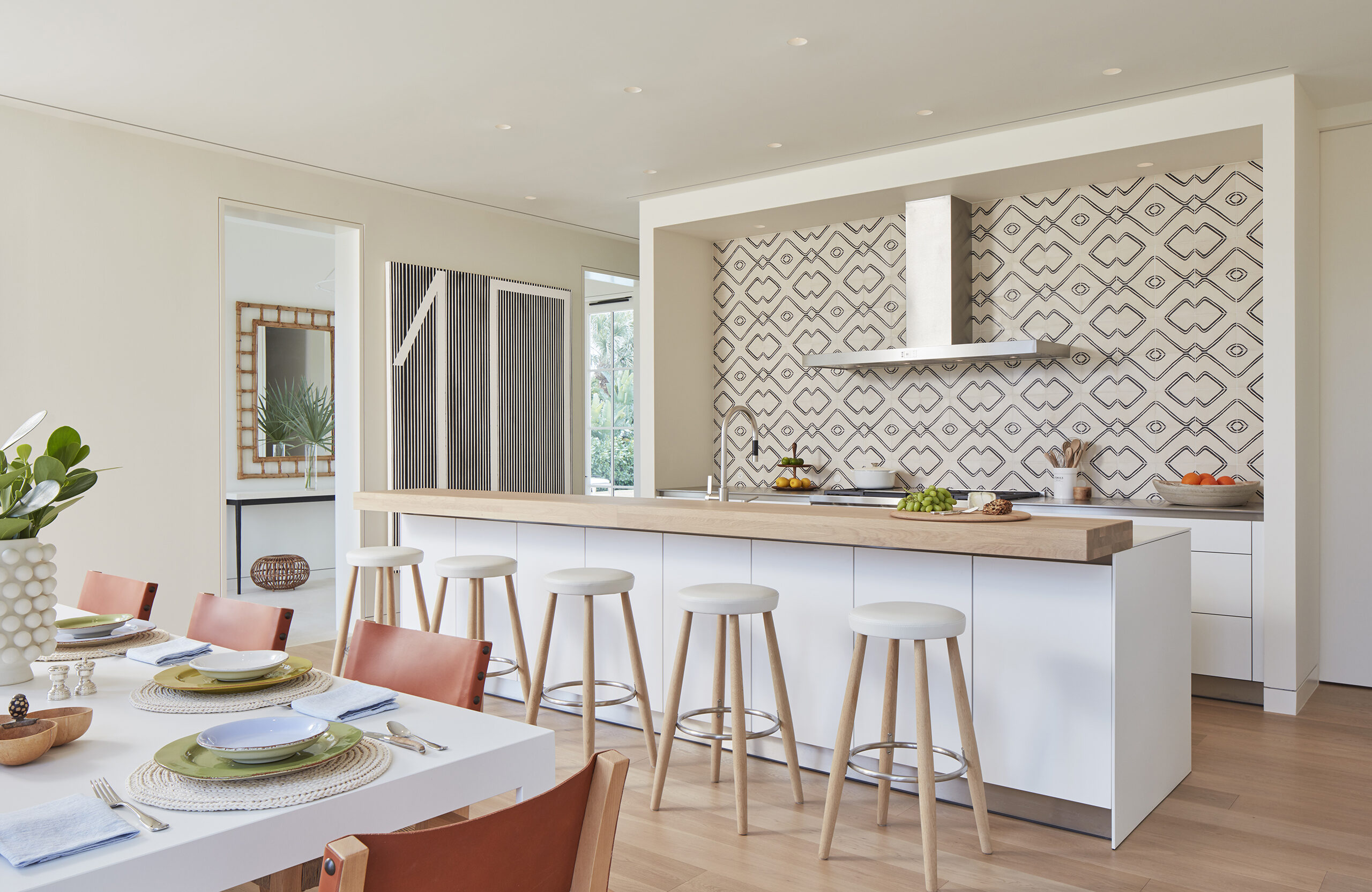Designed by homeowner and interior designer Britt Taner, the bright interiors draw on the semi-tropical landscape, animating a simple white architectural shell with bold colors and patterns. Beneath a pitched roof, a singular open interior volume frames views to a private courtyard and is flooded with natural light through expansive glazing.