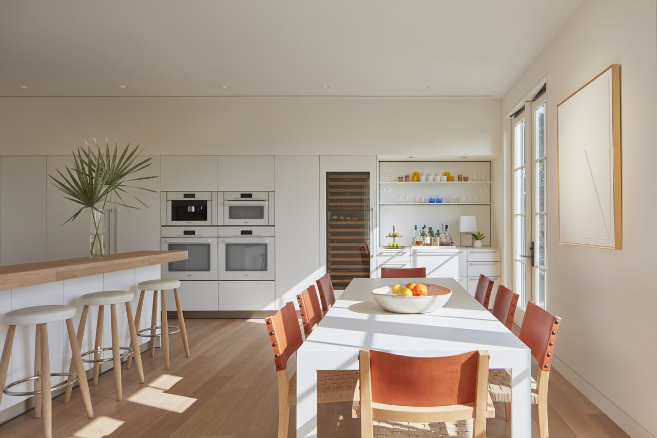 Composed entirely of a white masonry wall and punched openings, the pool pavilion’s exposed structural roof framing is the most primitive expression of the building type, removed from any function other than shade from the sun, shelter from the rain, and privacy from the street. It stands opposite the living-dining pavilion, a more developed form that nonetheless maintains simplicity and features a singular interior volume that echoes the balanced, symmetrical shapes of the exterior. This volume mediates between the private courtyard and distant views of the landscape and town center to the east, making it perfect for both family time entertaining.