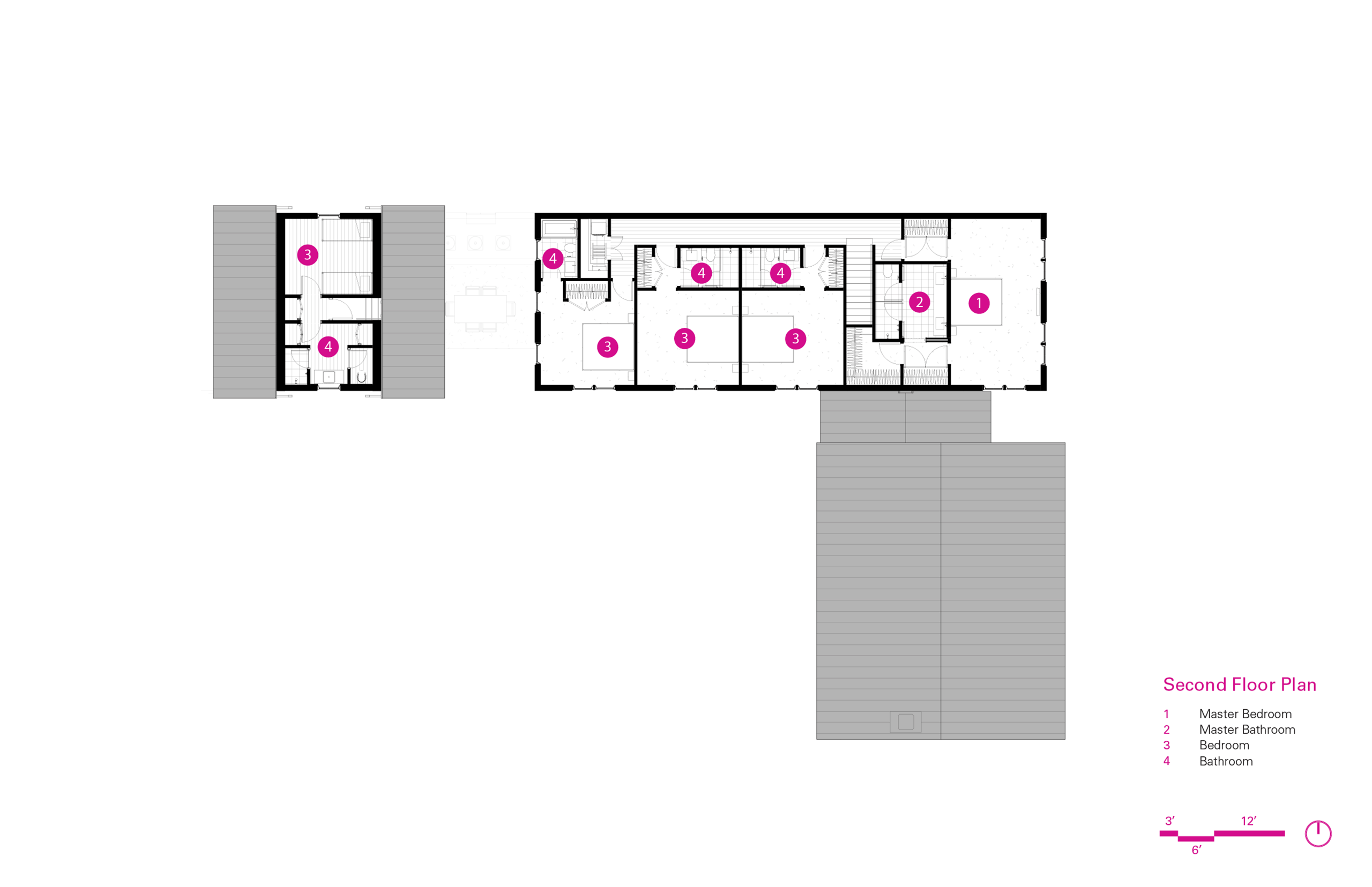 Functional family spaces of kitchen, baths, bedrooms, and closets are housed in a two-story pavilion to the north, open to the sun and courtyard to the south. Additionally, a separate guest suite is tucked under the roof of the garage-pavilion. A row of privacy hedges and columnar trees complete the enclosure of the courtyard.