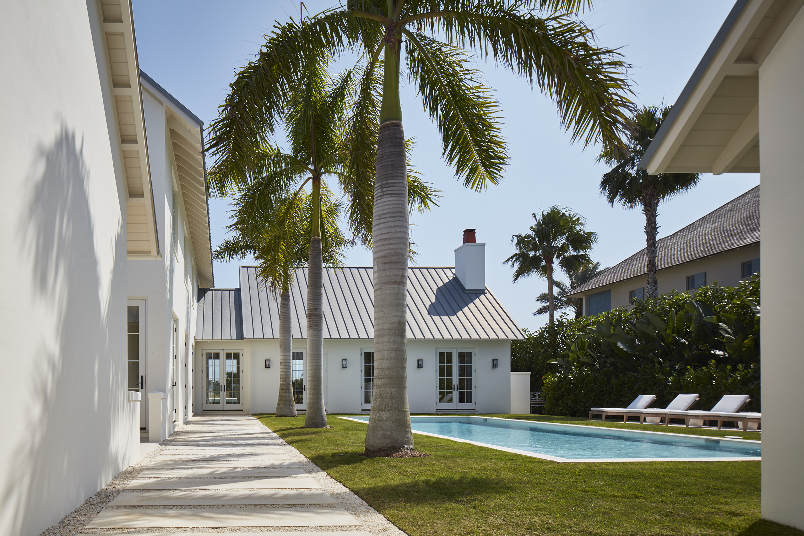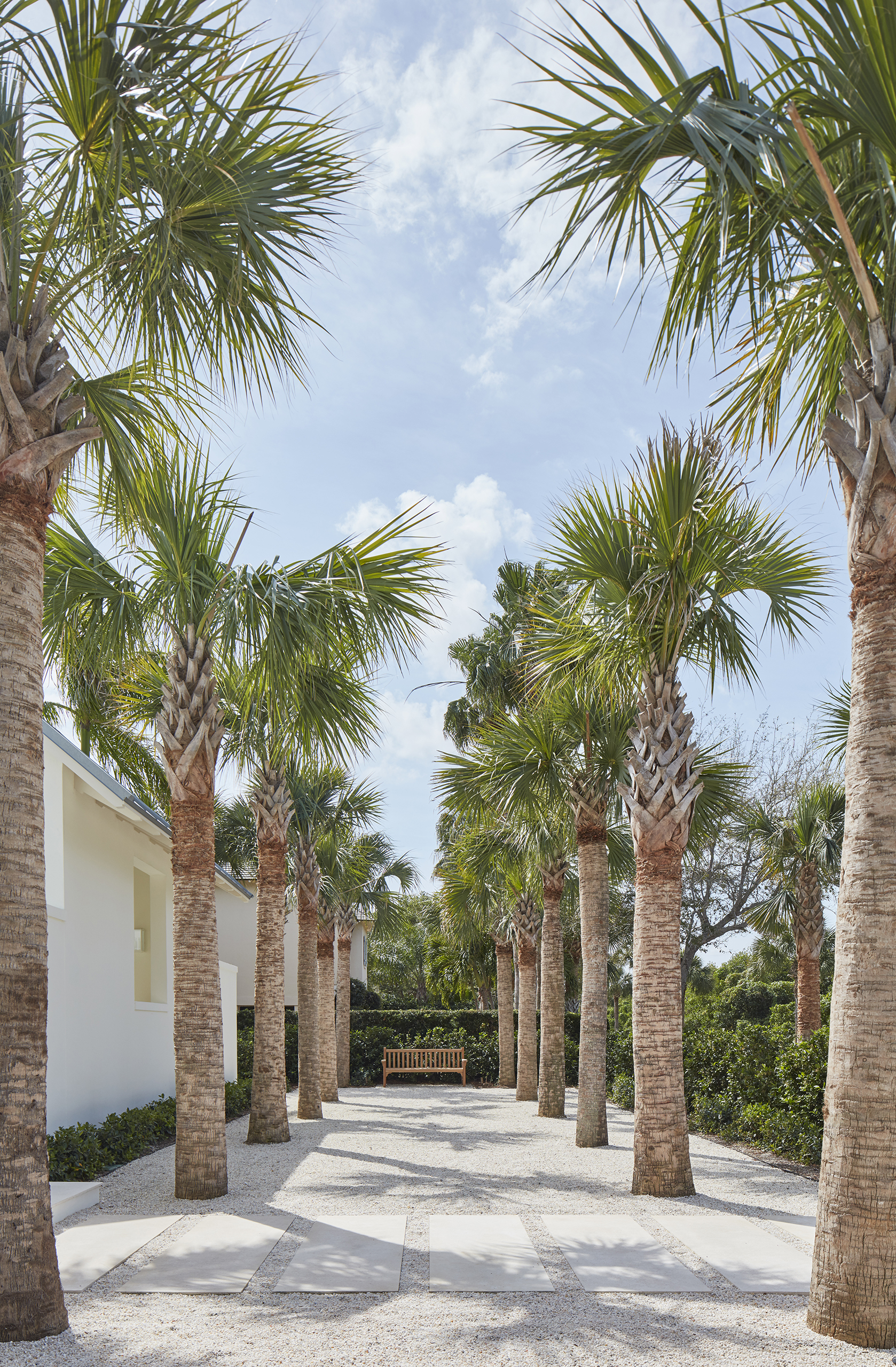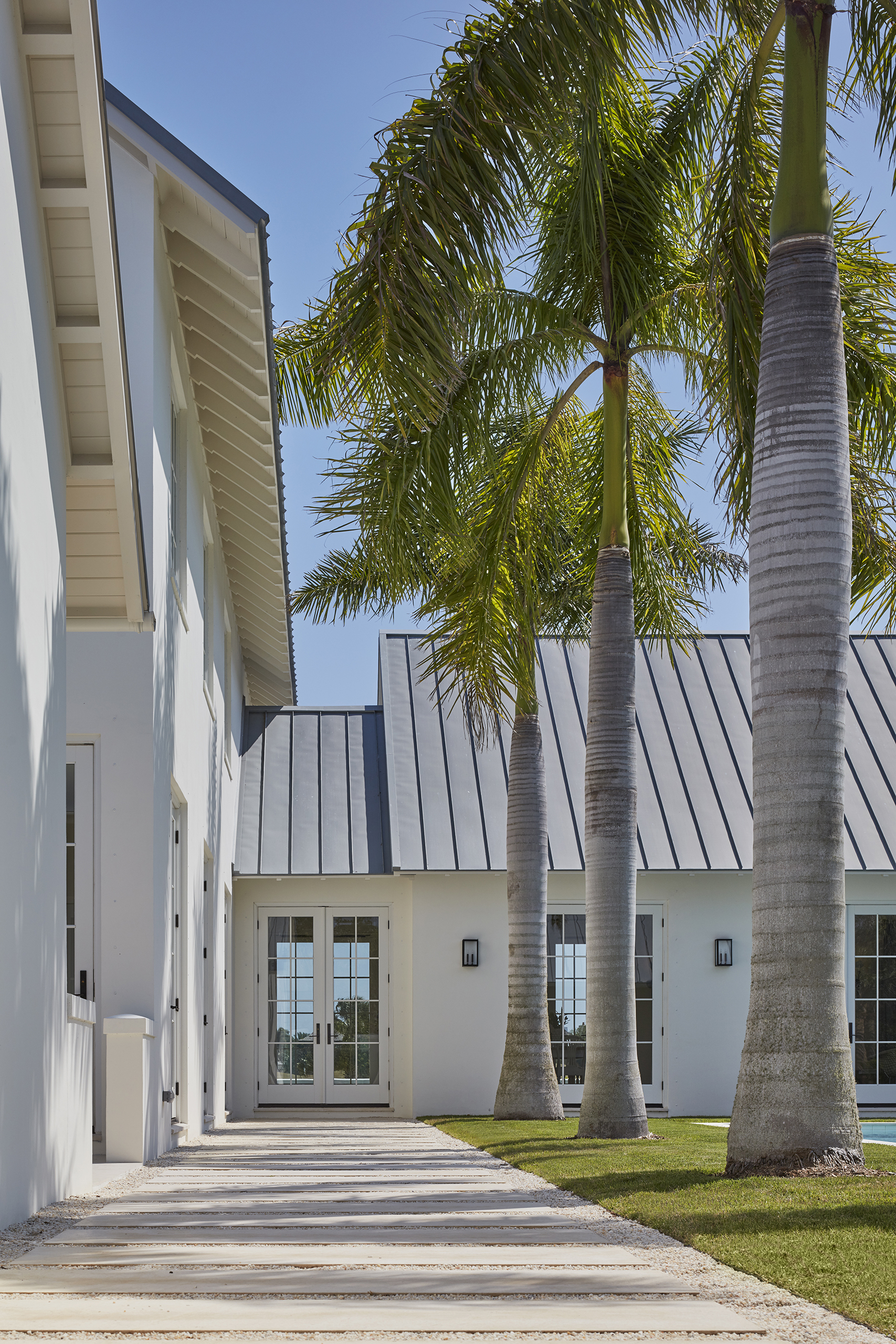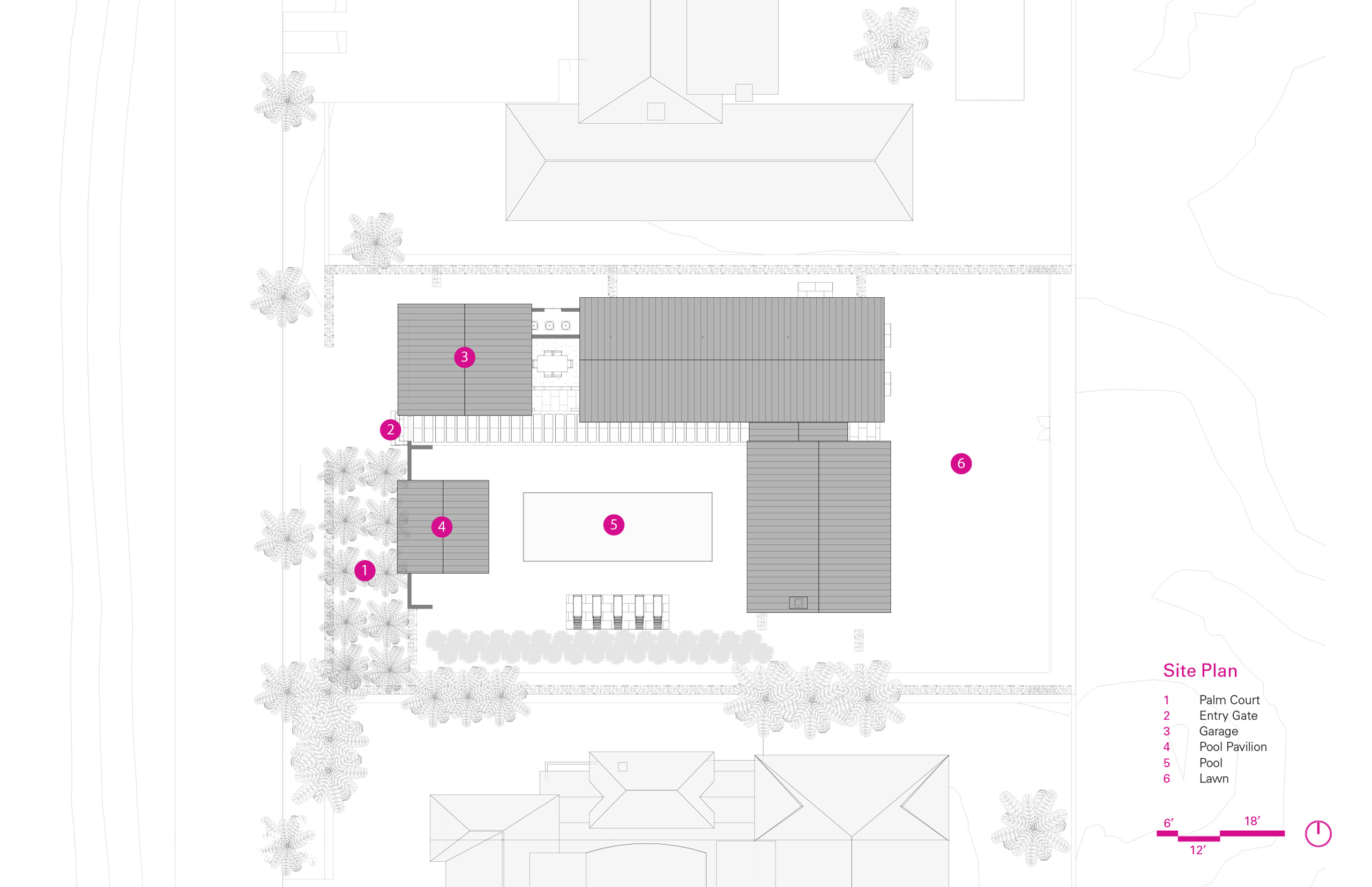 Entry into the home begins through a landscaped entry court along the west side of the site that doubles as guest parking in between a colonnade of palms atop crushed gravel. A white stucco retaining wall extends from the back of an open-air pool pavilion to guard the entrance into the courtyard and procession to the main door.
