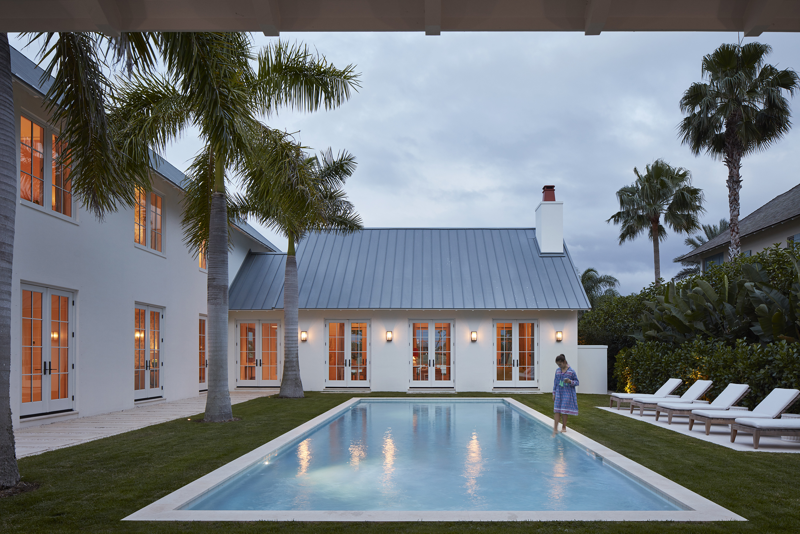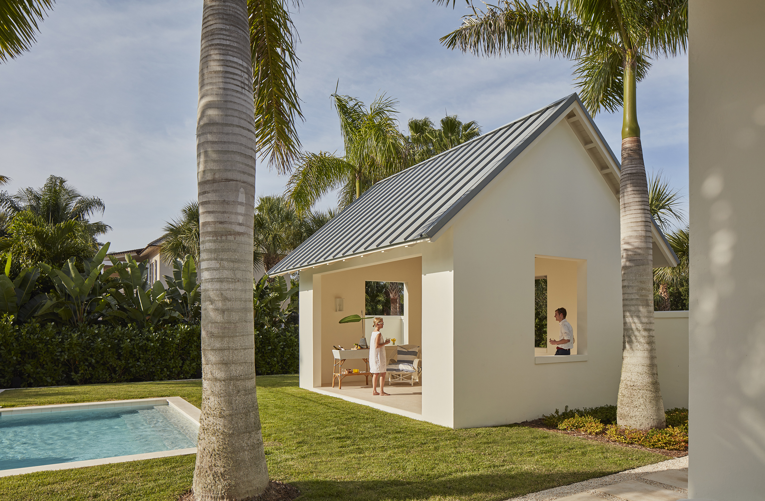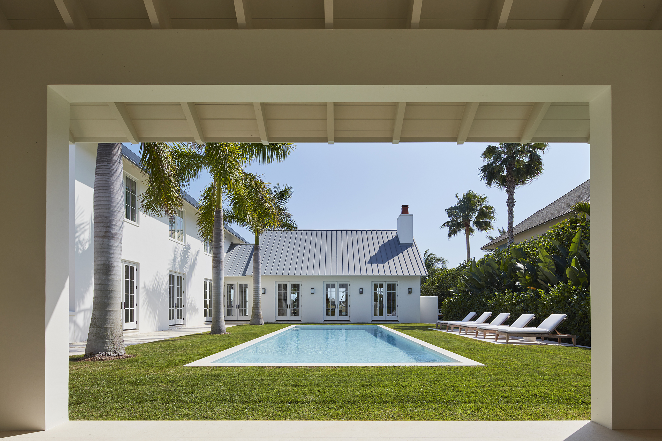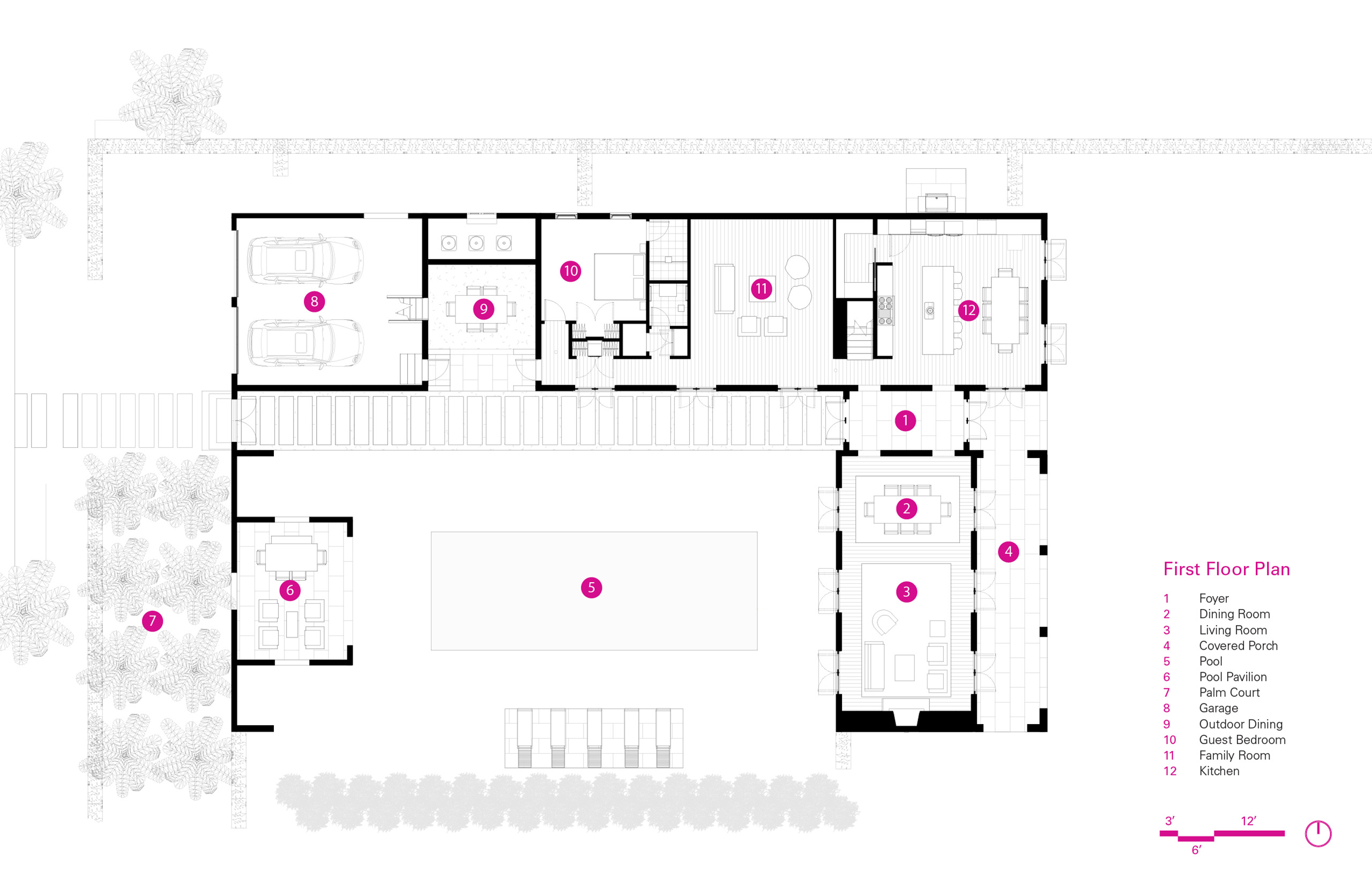 Entry into the home begins through a landscaped entry court along the west side of the site that doubles as guest parking in between a colonnade of palms atop crushed gravel. A white stucco retaining wall extends from the back of an open-air pool pavilion to guard the entrance into the courtyard and procession to the main door.