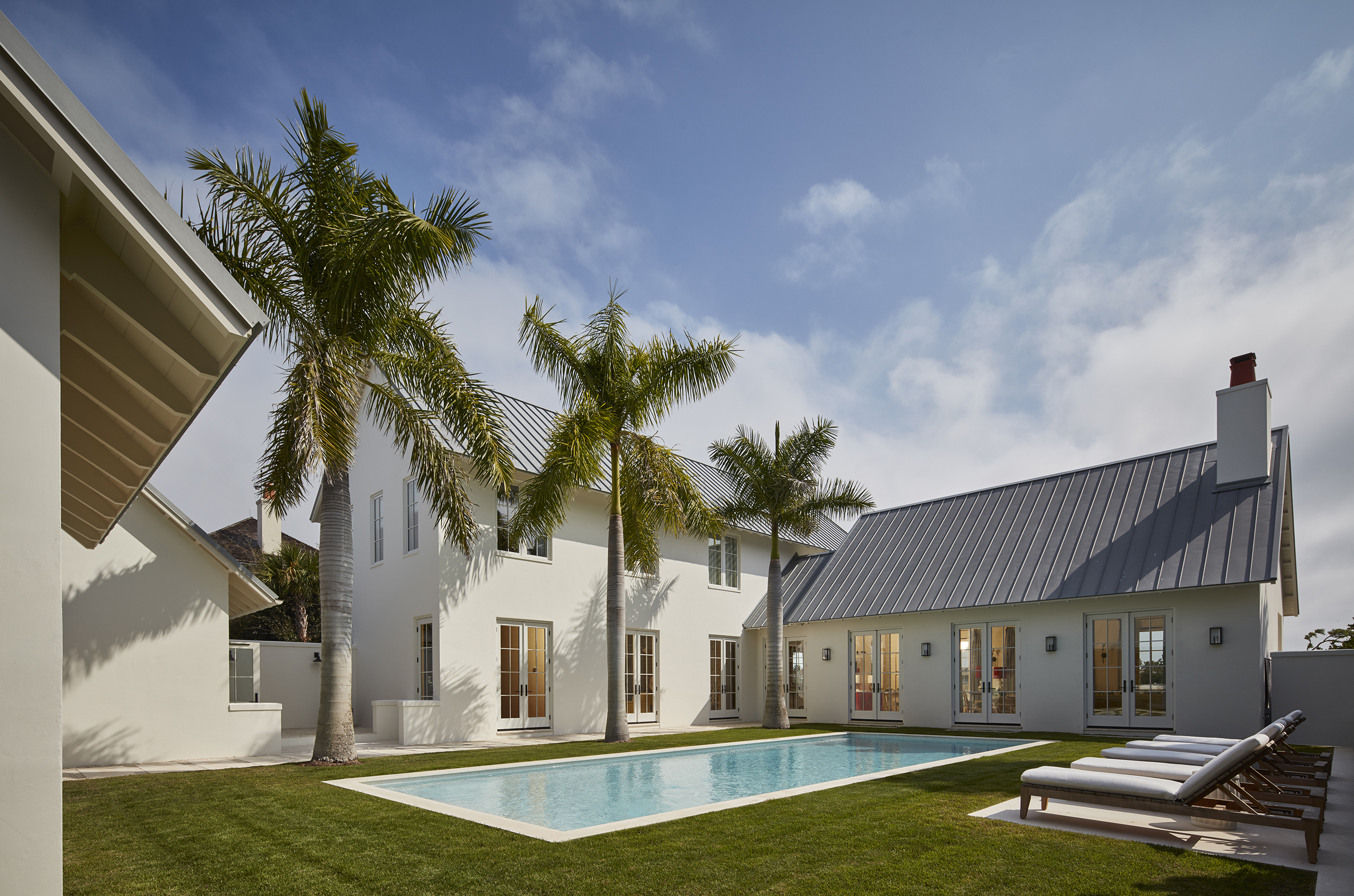 Although limited in size and aesthetic range, the home maintains simple, direct forms. Four pavilion volumes of varying scale, shape, and function are arranged around a pool and courtyard oriented to the sun. Roofs are steeply pitched with broad overhangs, complying with guidelines while maintaining their purest distinct form.