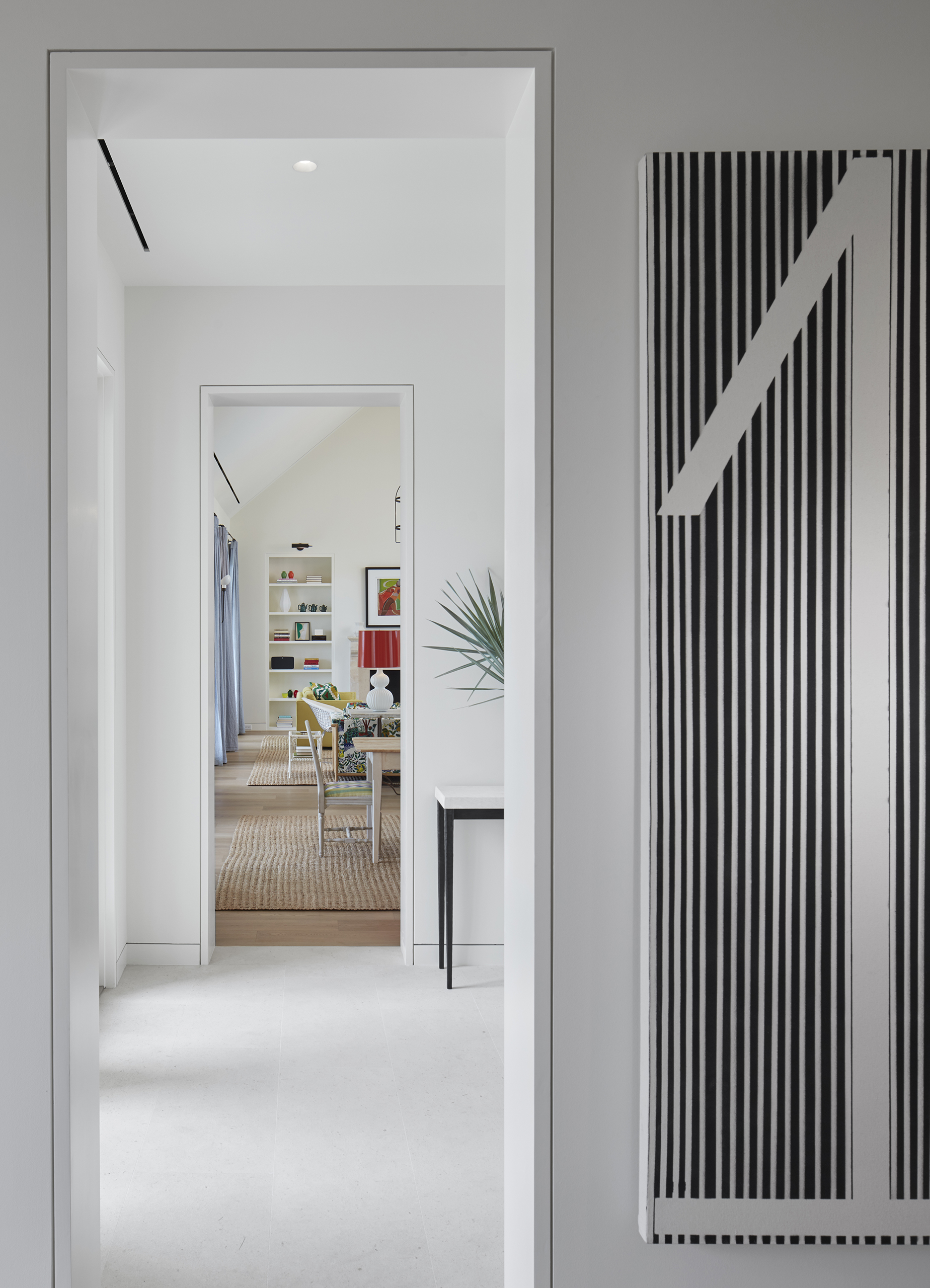 Designed by homeowner and interior designer Britt Taner, the bright interiors draw on the semi-tropical landscape, animating a simple white architectural shell with bold colors and patterns. Beneath a pitched roof, a singular open interior volume frames views to a private courtyard and is flooded with natural light through expansive glazing.