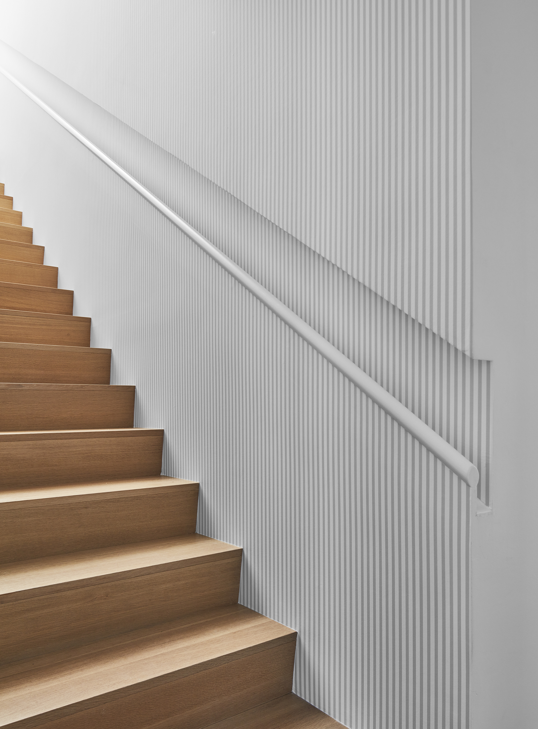 Composed entirely of a white masonry wall and punched openings, the pool pavilion’s exposed structural roof framing is the most primitive expression of the building type, removed from any function other than shade from the sun, shelter from the rain, and privacy from the street. It stands opposite the living-dining pavilion, a more developed form that nonetheless maintains simplicity and features a singular interior volume that echoes the balanced, symmetrical shapes of the exterior. This volume mediates between the private courtyard and distant views of the landscape and town center to the east, making it perfect for both family time entertaining.