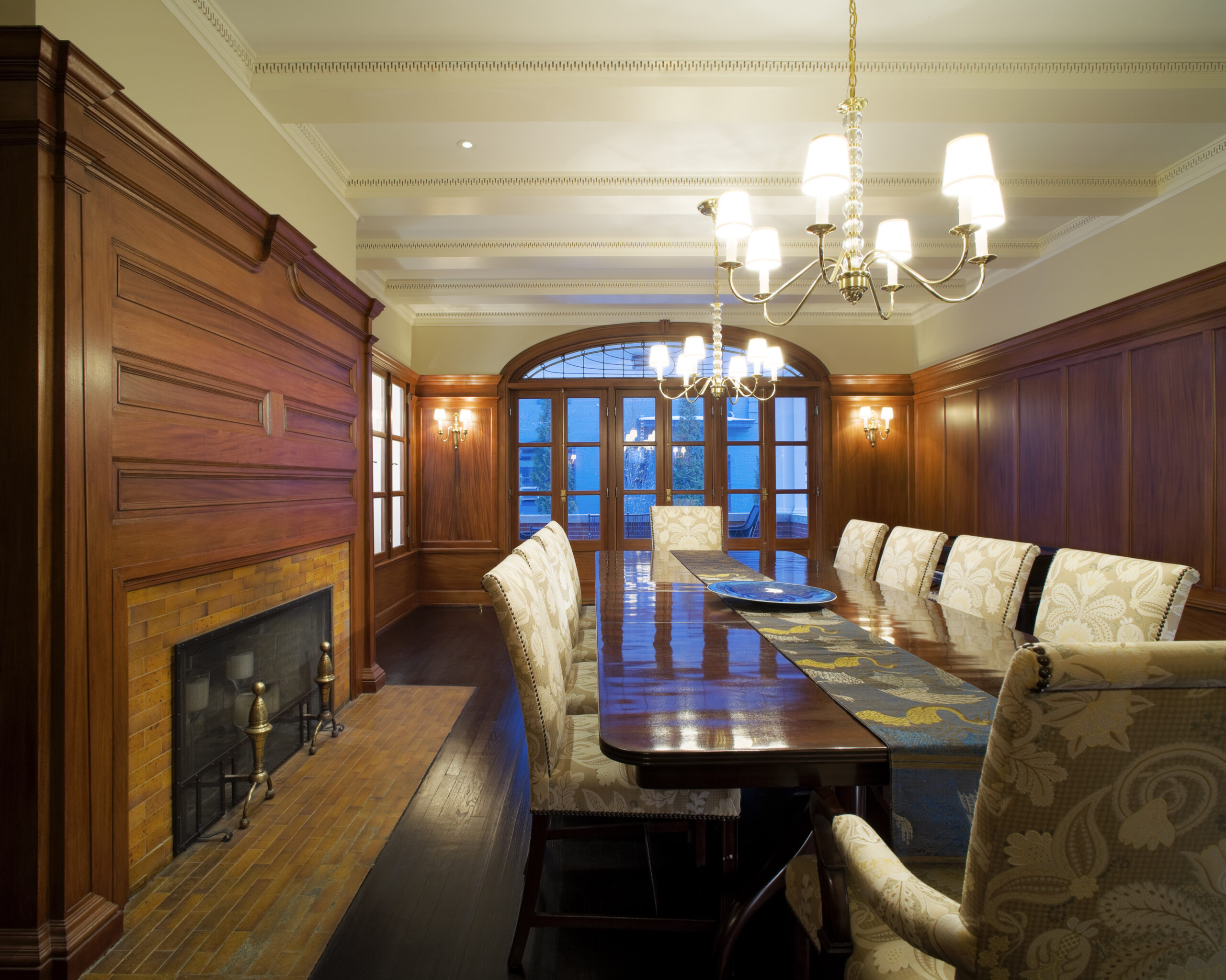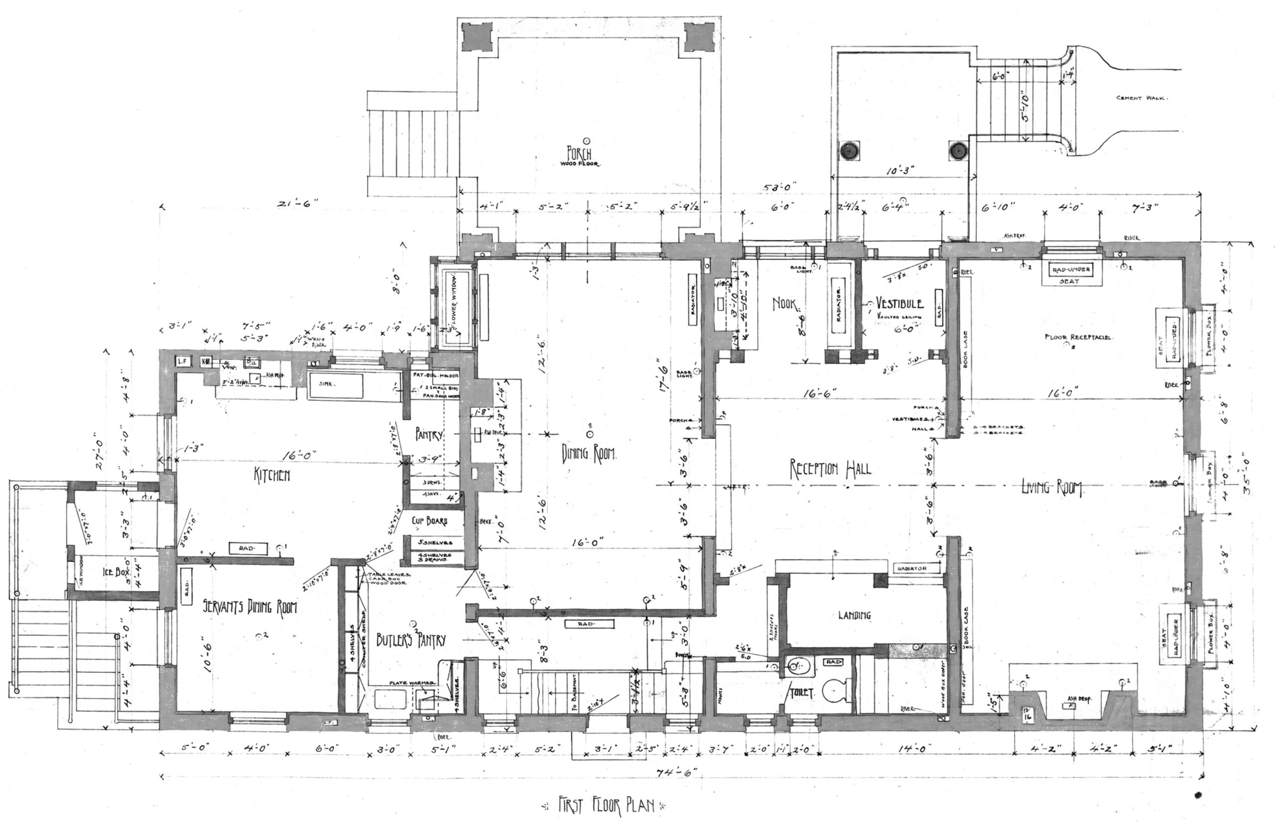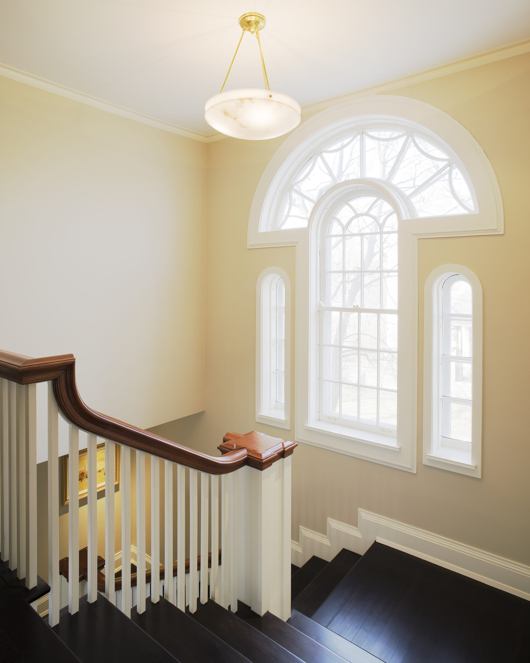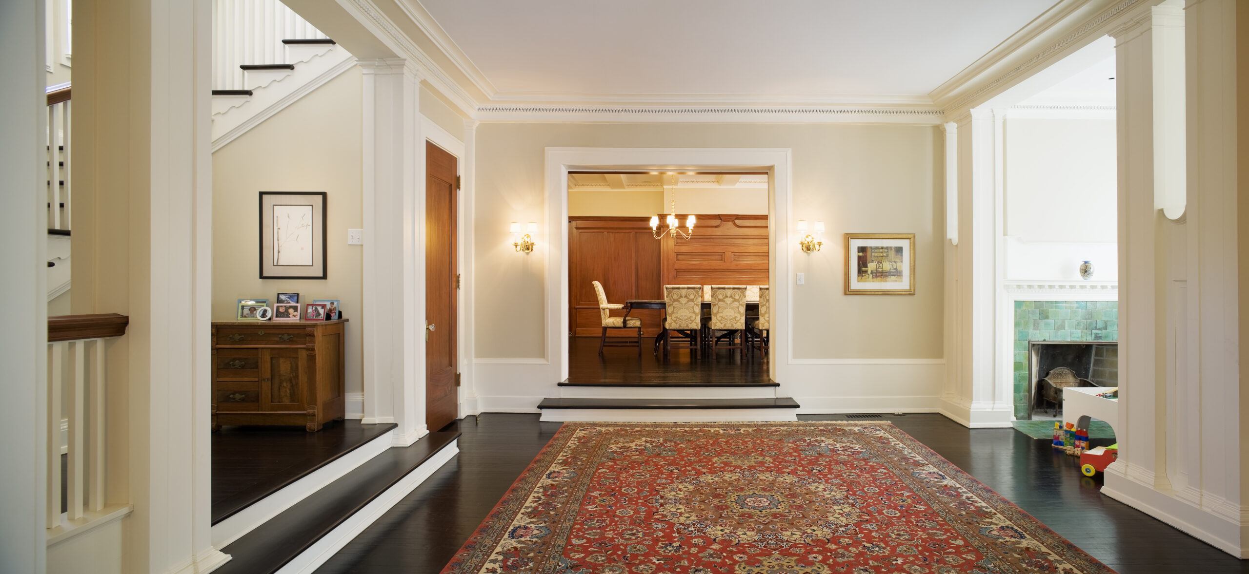 Though the exterior form and details throughout are of the Georgian Revival style, Garden’s Prairie School influence is apparent in the interior planning of the first floor with its open and continuous public spaces that maximize daylight, views and connection to the exterior porches and gardens.