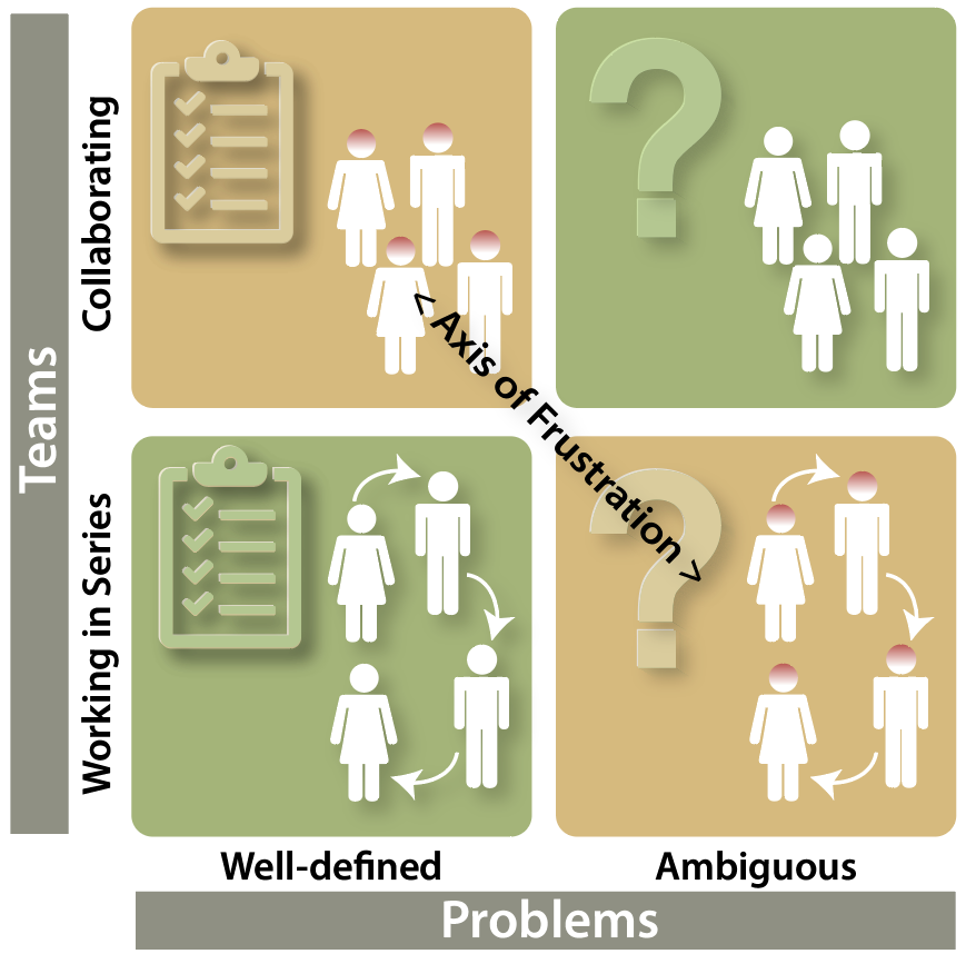 In contrast, the other diagonal in the grid is the “axis of frustration”, where people shift between trying to solve well-defined problems in groups and ambiguous ones in a step-by-step process. The former wastes everyone’s attention and the latter wastes everyone’s time by drawing out each iteration.