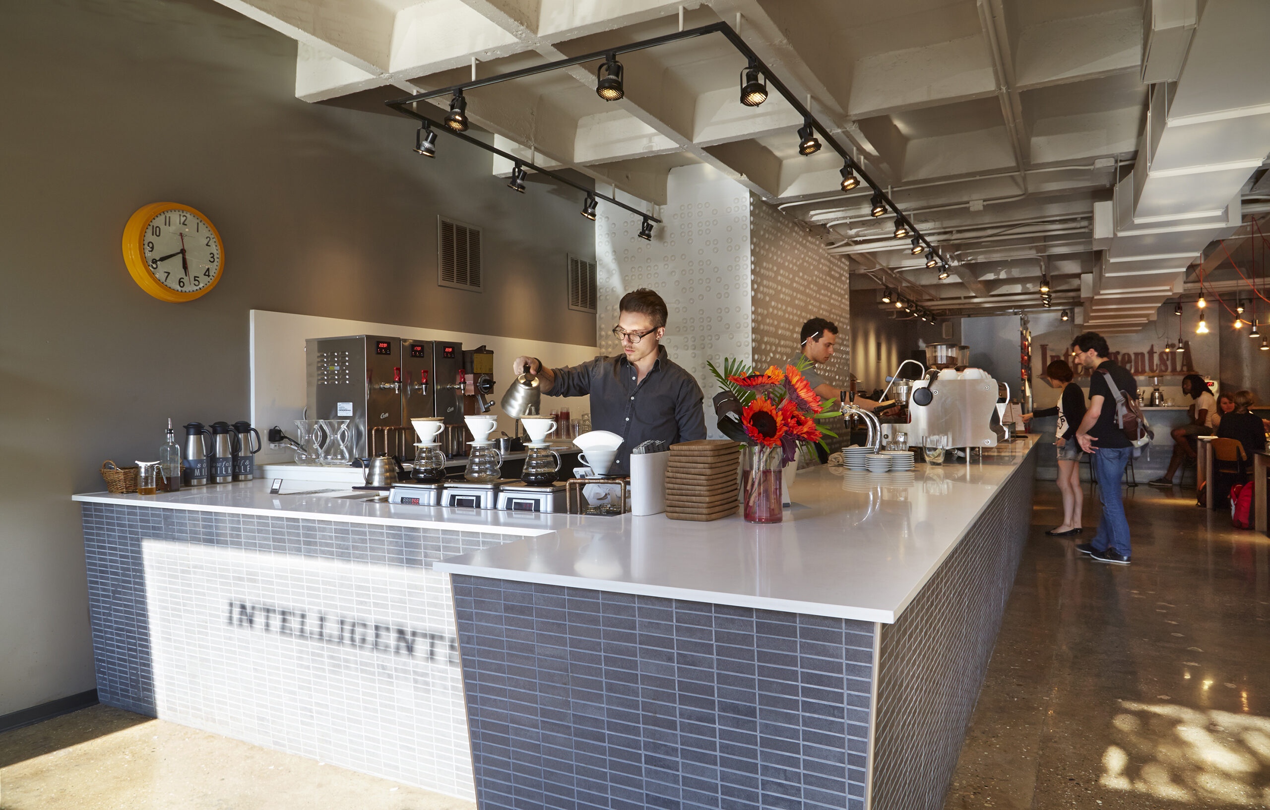 Intelligentsia’s flagship Broadway store is featured in the LD+A Magazine, August 2014 issue for lighting design and application. Samantha Schwirck discusses how the sculpture-like lighting system seeks to blend many of the qualities of the original location with the companies’ progressive ideas of brewing and serving coffee. Visit the full project here.